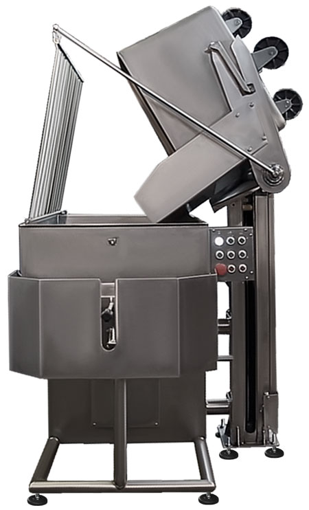 При заказе с фаршемешалкой подъемник агрегируется с данным оборудованием. В комплексном исполнении ускоряется процесс загрузки продукции, подъём и опускание тележки синхронизированы с открыванием решёток безопасности, закрывающих дежу мешалки.